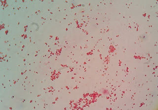 Esta foto es de muestra bucal sembrada en placa con agar nutritivo, observamos que los puntos son cocos que son de color rojo aunque deberían estar de color violeta (Gram positivos) porque la tinción no está hecha correctamente y los puntos negros son levaduras. Los cocos se agrupan en racimos por lo que la especie es del genero Staphylococcus.